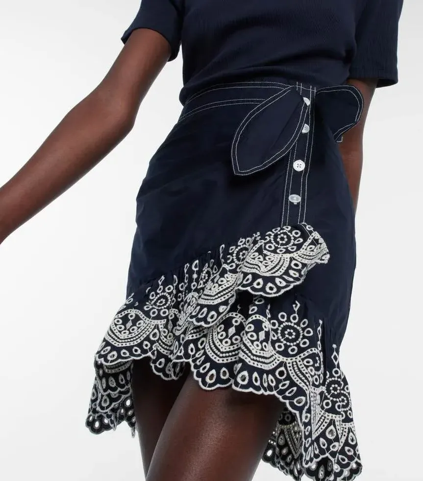 lt's made from a cotton blend to a fitted silhouette, featuring belt detailing at the waist and an intricately embroidered, asymmetric hem.