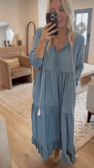 Maxi long denim dress for women, featuring ruffled v-neck with drawstring & big tiered bottom, classic a line flare silhouette, ankle length, long sleeve with button cuff. Loose fit tunic dress fit all figure types, perfectly hide tummy fat and offer a stylishly slouchy look.