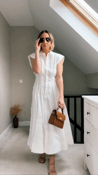 Calf-length, sleeveless dress in soft cotton twill. Collar, concealed buttons down the front, shoulder pads and a tapered waist with pleats at the front and back. Discreet side pockets and a flared skirt with insets for added volume.
